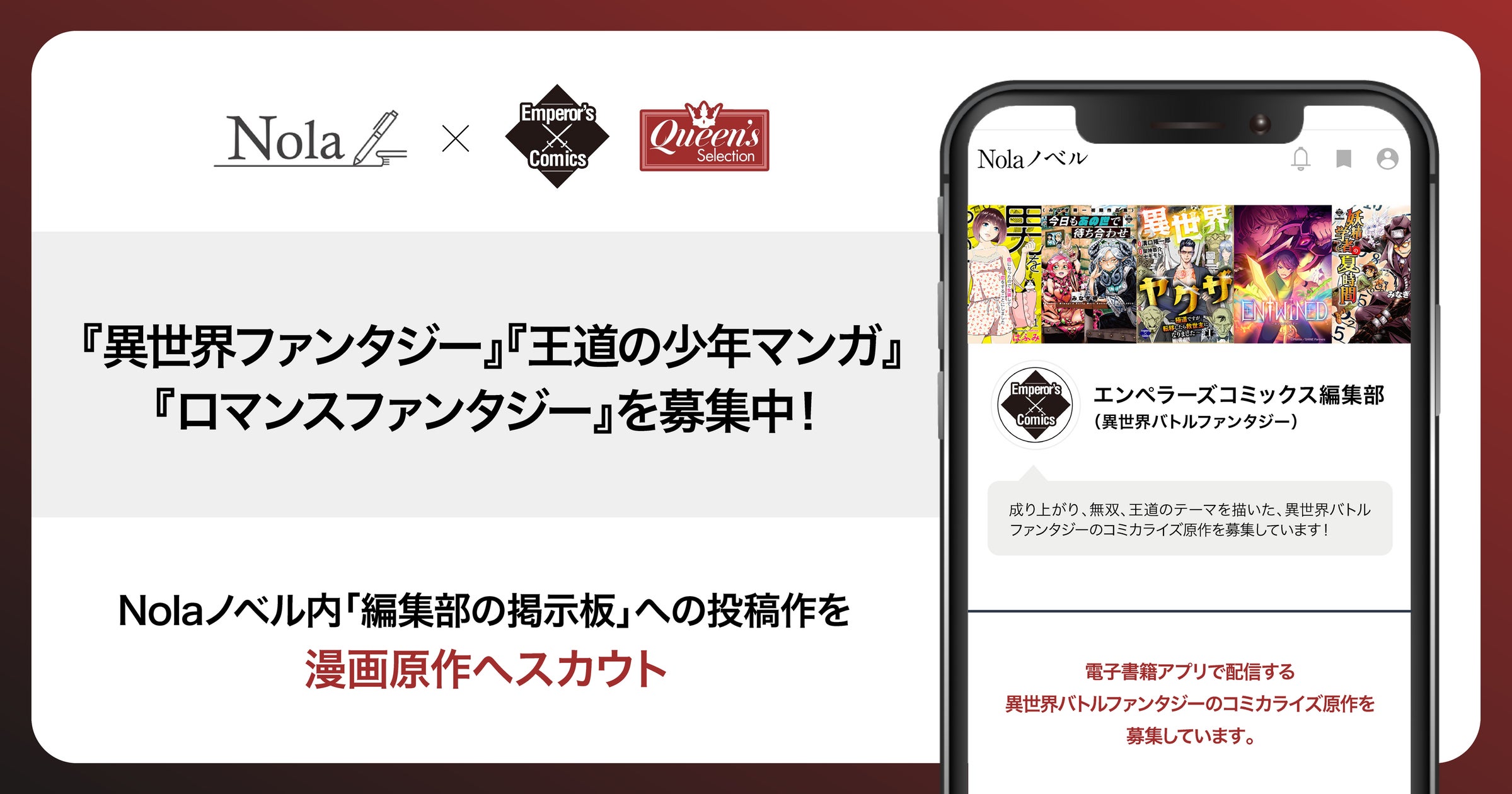 小説投稿サイト・Nolaノベルにある編集部の掲示板に「エンペラーズコミックス編集部(少年)」「エンペラーズコミックス編集部(異世界バトルファンタジー)」「クイーンズセレクション&シャルロット文庫編集部」の情報を追加しました。