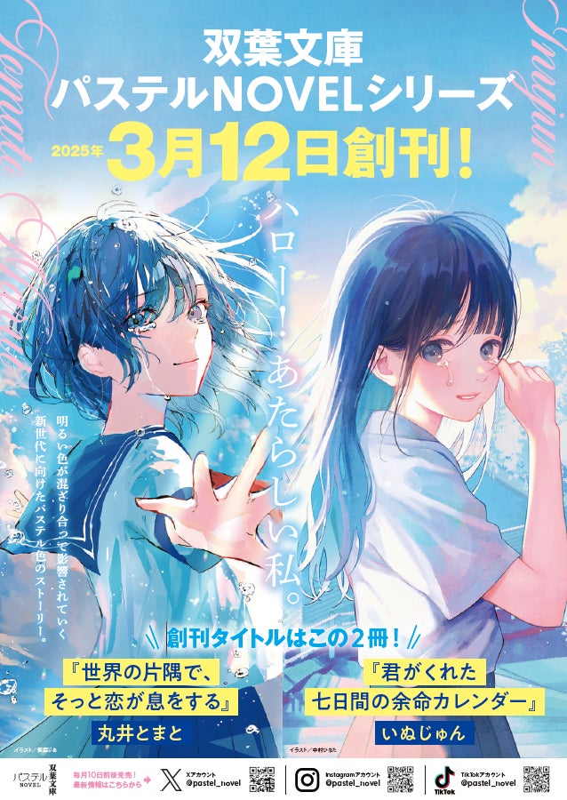 双葉社は、10代向けライト文芸の文庫新レーベル「双葉文庫パステルNOVEL」を創刊し、第一弾として『君がくれた七日間の余命カレンダー』(著:いぬじゅん)、『世界の片隅で、そっと恋が息をする』(著:丸井とまと)の2冊を3月12日(水)に発売することを発表しました。