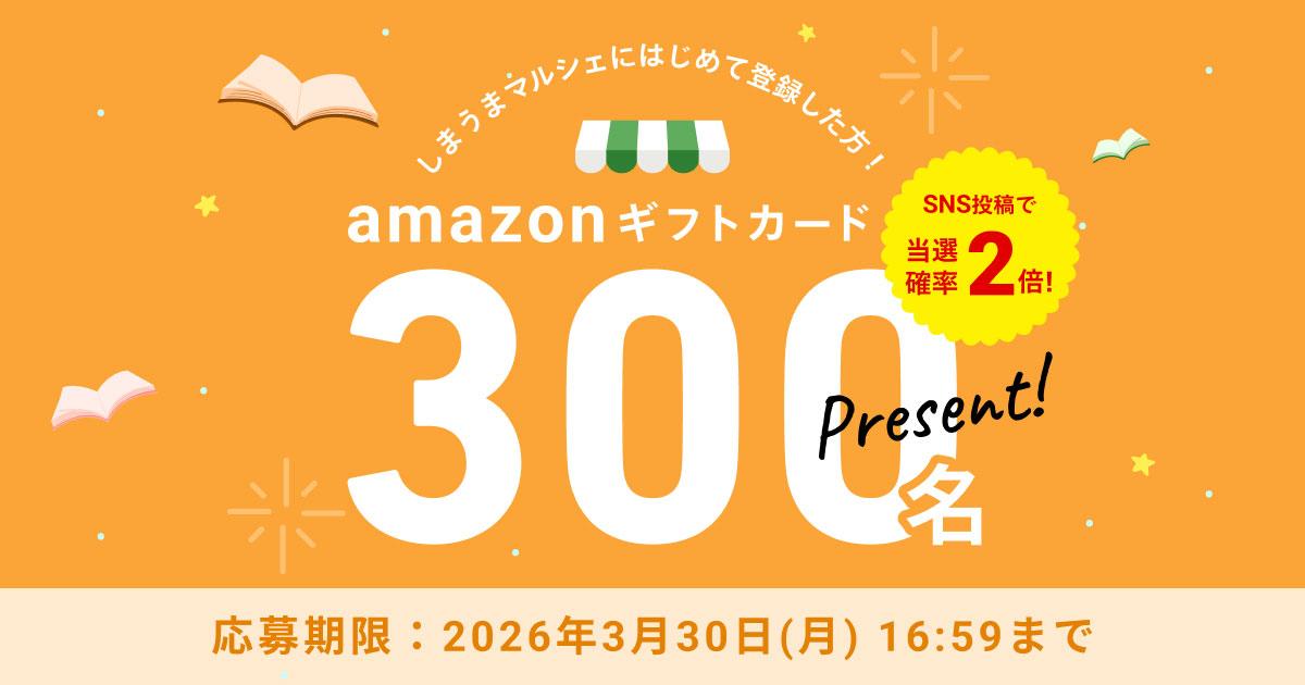 今ならしまうまマルシェに初めて登録していただいた方に抽選で300名にAmazonギフトカードが当たるキャンペーンを実施中です!